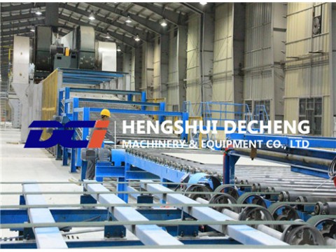 This production line used  the  calcined gypsum powder, water and various additives are automatically and separately measured and conveyed into the mixer by continuous auto-conveying system. After well mixed into slurry and spreaded onto the gypsum board protective paper which is continuously moving forward. During the progressing process, the slurry is gradually dispersed with vibration, and jointed with back protective paper.  When going through extruded shaping machine, the slurry is fully wrapped by upper and lower paper, pressing into well-regulated flat board which is continuously brought forward as per a stable and strictly controlled speed. After any minutes , the calcined gypsum in the slurry is hydrated again and crystallized into tiny interpenetrative dihydrate gypsum crystal with higher strength. And then, the wet gypsum board with a certain strength and regular shape is precisely cut into individual boards with set size by an auto-controlled cutting system. The individual boards are orderly arranged, turned over by program control system and brought into the dyer. In the dryer, the absorbed water in the boards is evaporated away. following strict drying system(The crystal water in the gypsum crystal has no loss). After brought out from the dryer, the boards are gradually cooled down in the running process. The front sides of every two boards are folded after turned over again, and the two ends are cut into boards with regular size and nice appearance by end sawing machine.  And finally the boards are conveyed to automatic stacking machine and stacked into well-ordered finished products before put into storage.